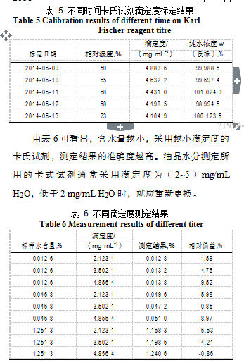 由表 5 可以看出,隨著時間的推移,卡氏試劑滴定度下降,是因為卡氏試劑受空氣中水的影響,即測試環境的濕度的增大。由于卡式試劑穩定性隨時間不斷變化,所以測定新樣品時,需要重新標定滴定度,并用卡氏試劑循環沖洗滴定管。